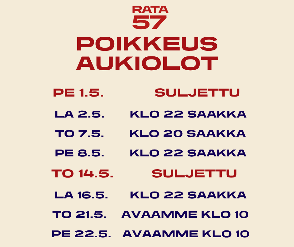 Rata 57 suljettu 1.5. ja 14.5.