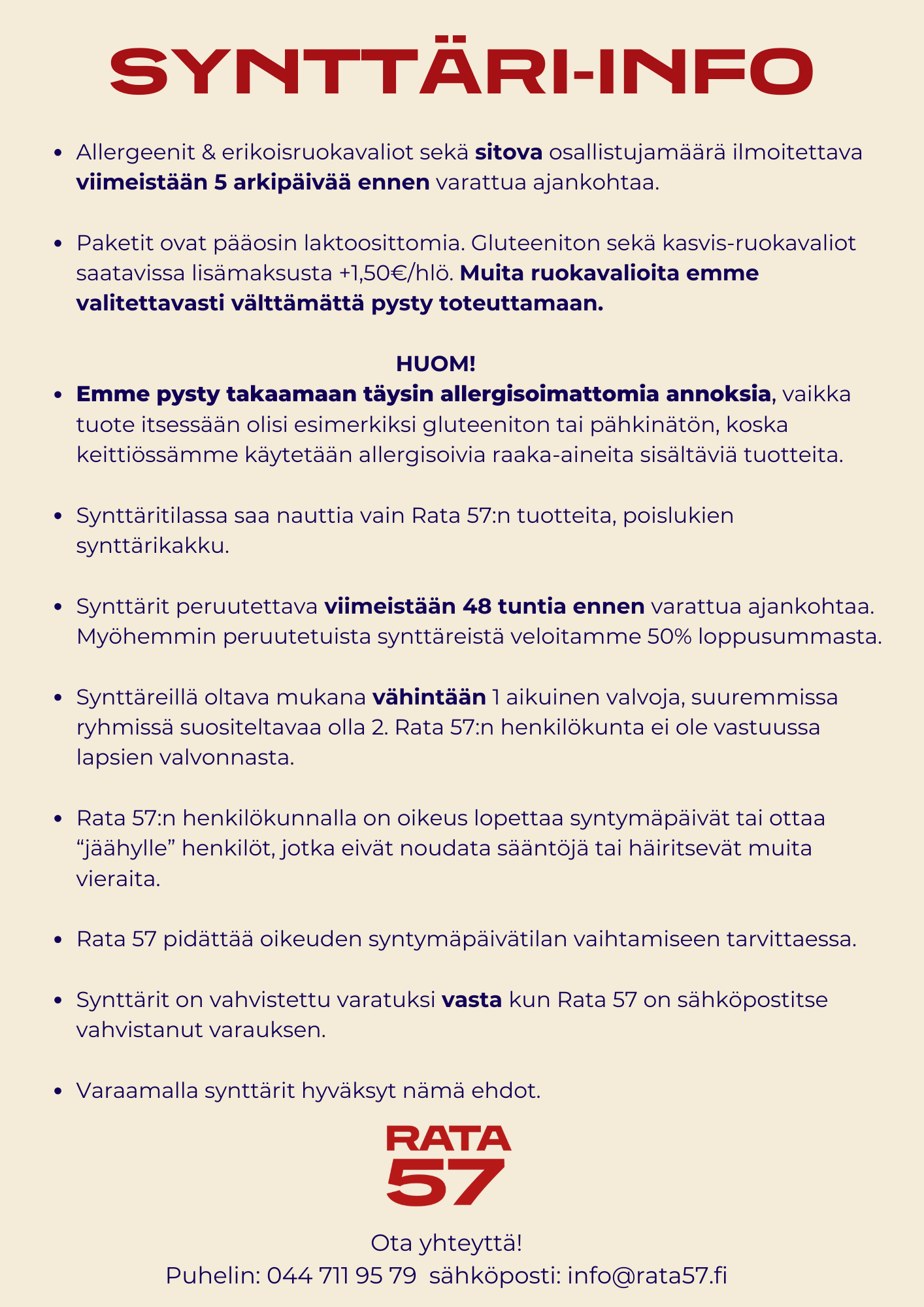Varaa myös hauska syntymäpäivätilamme, jossa voitte omassa rauhassa jakaa lahjoja, laulaa, nauraa ja pitää hauskaa! HUOM! Keilasynttärit eivät sovellu alle 6-vuotialle. Synttärien ehdot löydät tästä.
