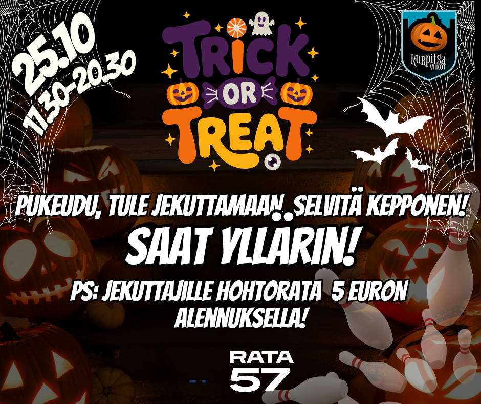 Rata 57 on mukana Kurpitsaviikoilla ja with Mischief Trick-or-Treat! Lapset HUOM! Tule 25.10. lauantaina 17.30-20.30 välisenä aikana Radalle ja pukeudu! Tule jekuttamaan meitä, selvitä kepponen ja saa yllätys! Kaikille jekuttajilla annamme lisäksi 5,00 euron alennuksen ratavarauksiin 17.30 eteenpäin! Muista Radan löydät uniikin pelitilan, jonka Halloween kuvatukset ovat ottaneet haltuunsa! Tule pelaamaan, jos uskallat!