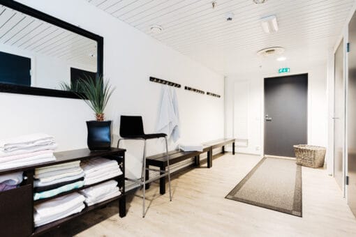 - Suuri näyttö oleskelutiloissa ja tilava pukuhuone